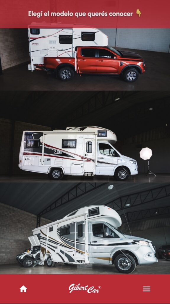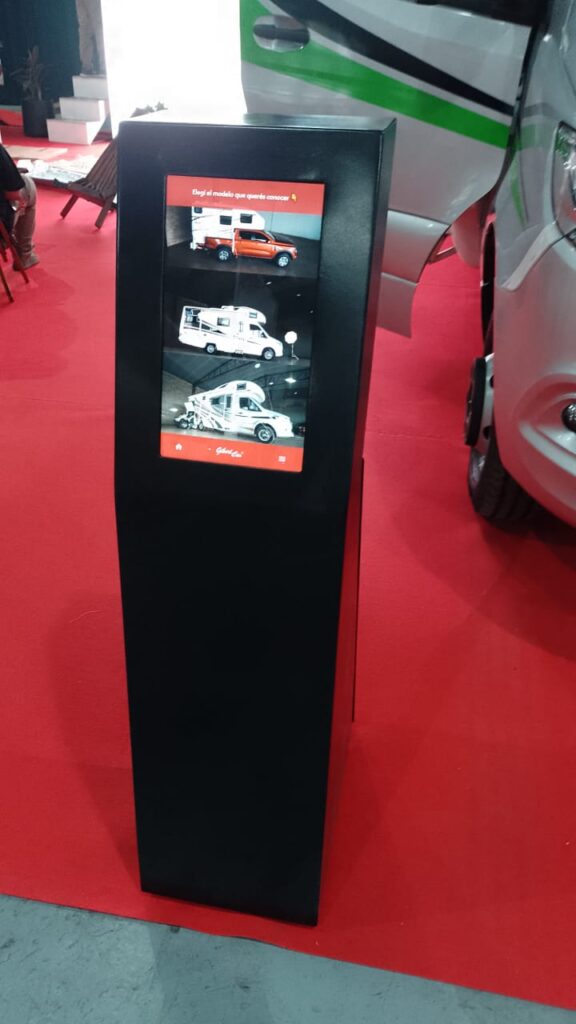 Diseñamos y desarrollamos un tótem interactivo que permite a los visitantes explorar los distintos modelos —Camper, Motorhome 4.30 y 5.20—, ver imágenes y detalles técnicos, y dejar sus datos de contacto si desean recibir más información.