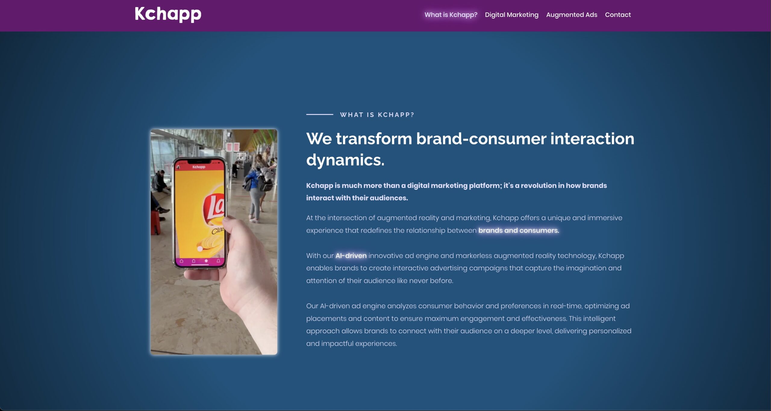 🚀 En Kchapp llevamos la innovación a otro nivel: desarrollamos una plataforma que permite que marcas creen anuncios de realidad aumentada (AR) en 3D, donde los usuarios pueden interactuar con productos en su entorno real. lleva la publicidad a una nueva dimensión.